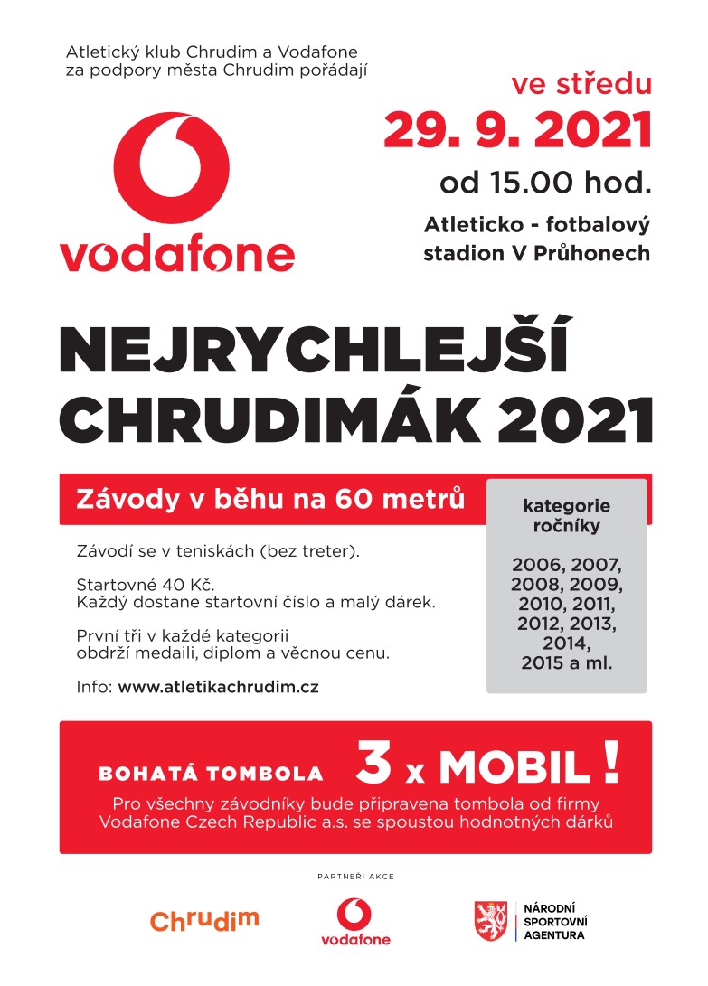 Zveme Vás na již 5. ročník závodů pro děti Vodafone nejrychlejší Chrudimák 2021, který proběhne ve středu 29.09.2021.