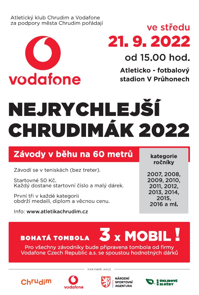 Zveme Vás na již 6. ročník závodů pro děti Vodafone nejrychlejší Chrudimák 2022 za podpory města Chrudim, který proběhne ve středu 21.09.2022.