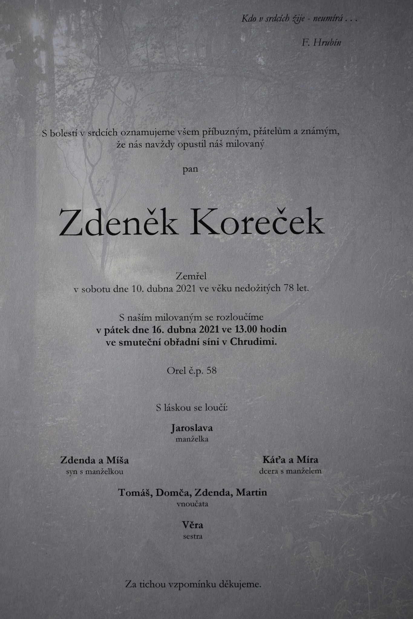 Rozloučení (při dodržení omezení shromažďování) proběhne ve pátek 16.04.2021 ve 13 hodin.